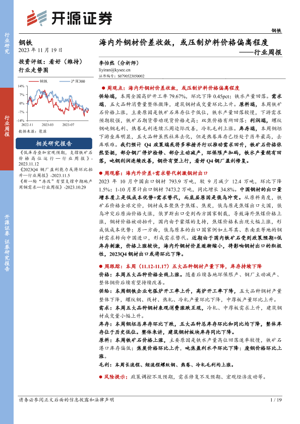 【开源证券】【20231119】20231119-开源证券-钢铁行业周报:海内外钢材价差收敛,或压制炉料价格偏离程度-19页