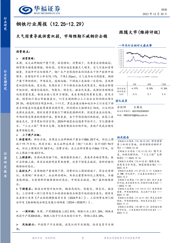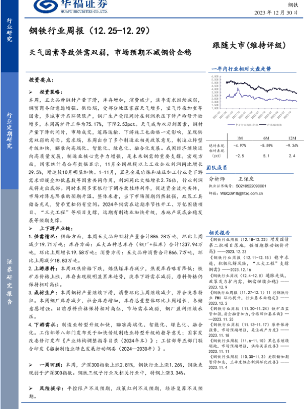 【华福证券】【20231230】钢铁行业周报:天气因素导致供需双弱,市场预期不减钢价企稳-18页