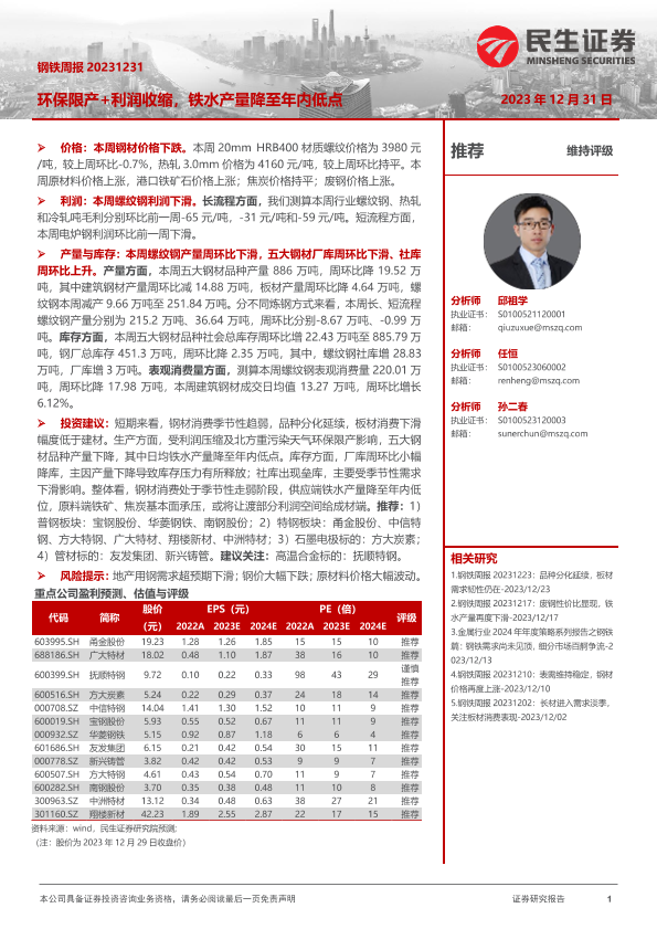【民生证券】【20231231】20231231-民生证券-钢铁周报:环保限产+利润收缩,铁水产量降至年内低点-20页