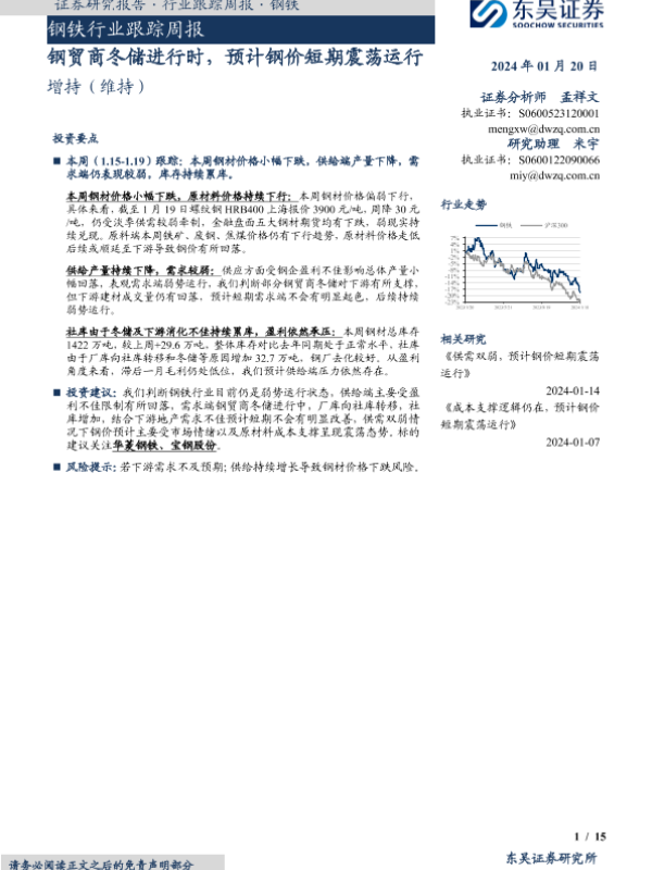 【东吴证券】【20240120】20240120-东吴证券-钢铁行业跟踪周报:钢贸商冬储进行时,预计钢价短期震荡运行-15页