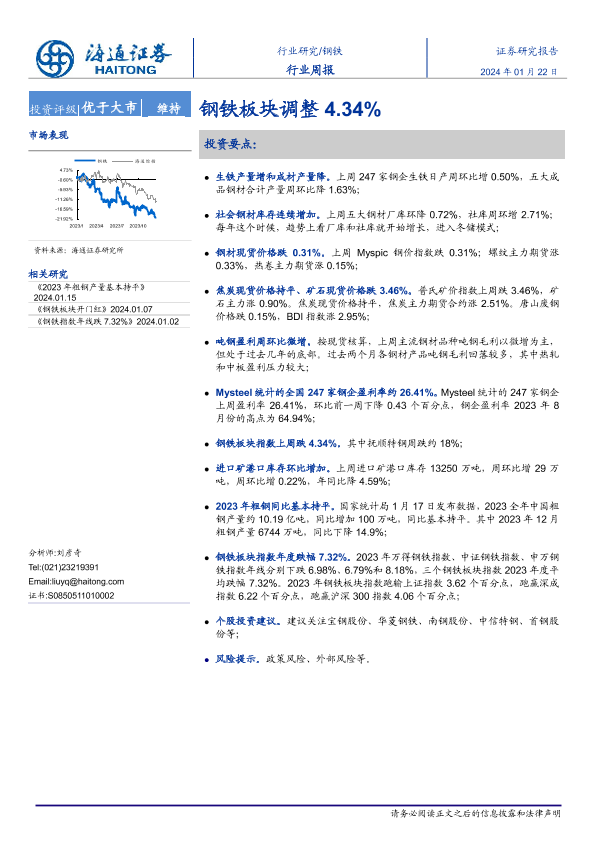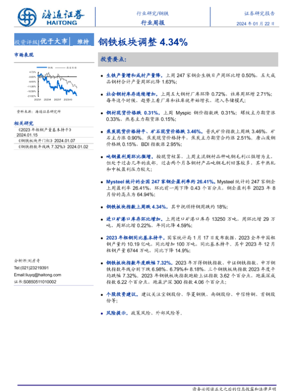 【海通证券】【20240122】20240122-海通证券-钢铁行业周报:钢铁板块调整4.34%-15页