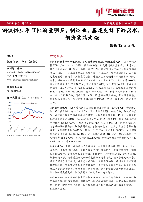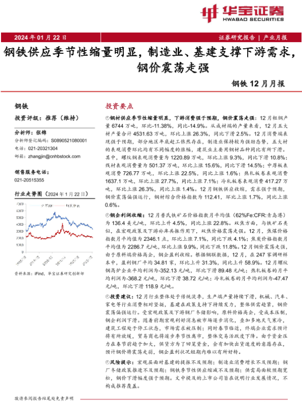 【华宝证券】【20240122】20240122-华宝证券-钢铁12月月报:钢铁供应季节性缩量明显,制造业、基建支撑下游需求,钢价震荡走强-17页