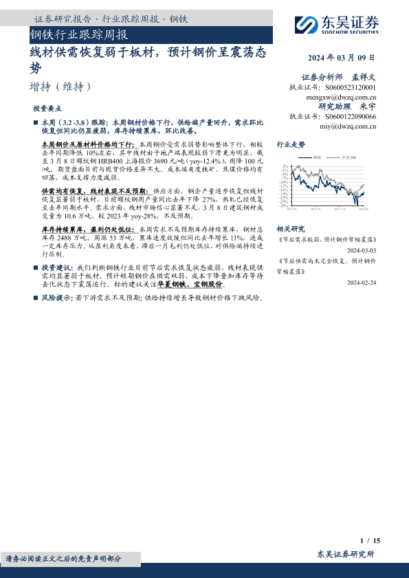 【东吴证券】【20240309】钢铁行业跟踪周报:线材供需恢复弱于板材,预计钢价呈震荡态势-15页