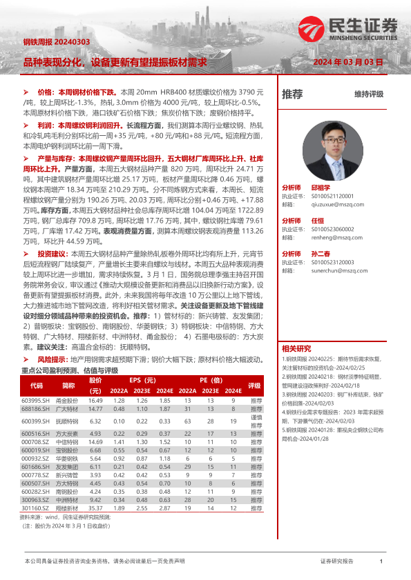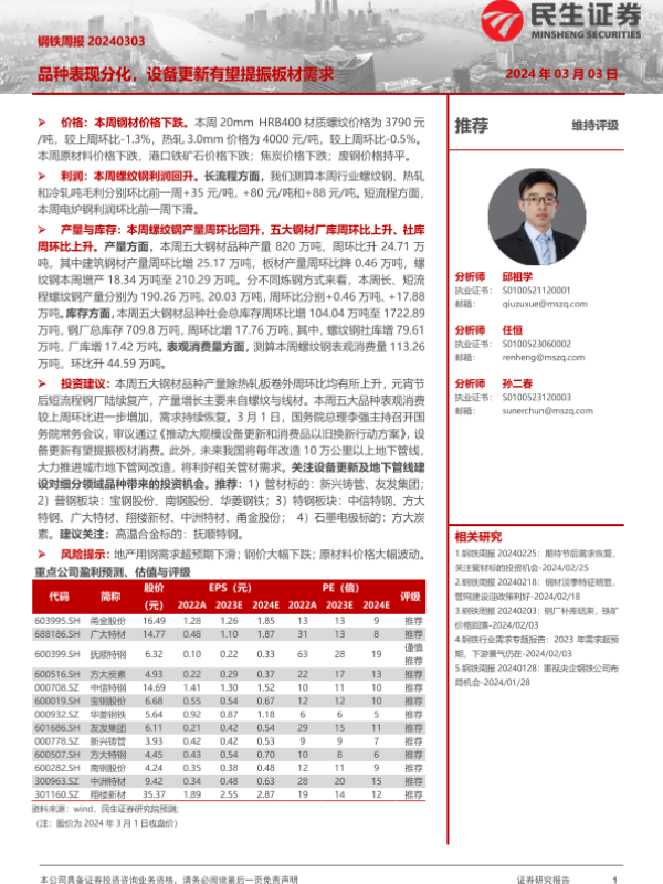 【民生证券】【20240303】20240303-民生证券-钢铁周报:品种表现分化,设备更新有望提振板材需求-20页