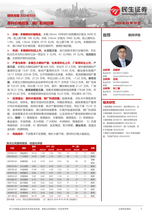 【民生证券】【20240310】20240310-民生证券-钢铁周报:原料价格回落,钢厂利润回暖-20页