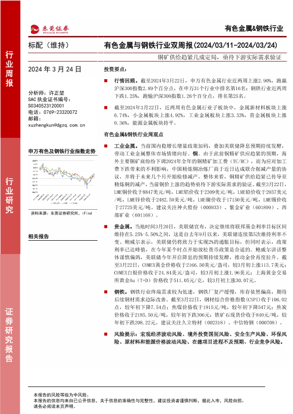 【东莞证券】【20240324】20240324-东莞证券-有色金属与钢铁行业双周报:铜矿供给趋紧几成定局,亟待下游实际需求验证-14页