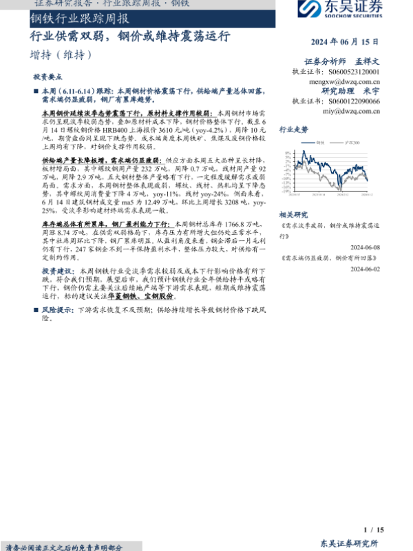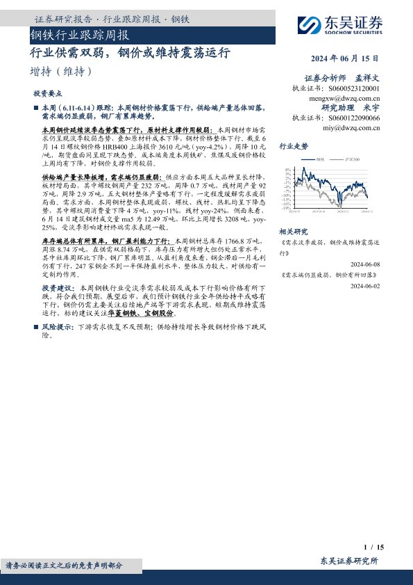 【东吴证券】【20240615】20240615-东吴证券-钢铁行业跟踪周报:行业供需双弱,钢价或维持震荡运行-15页