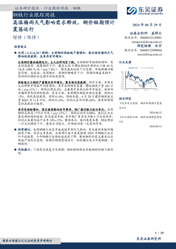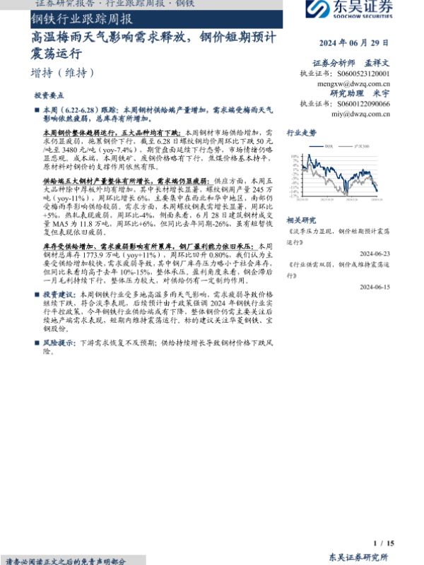 【东吴证券】【20240629】20240629-东吴证券-钢铁行业跟踪周报:高温梅雨天气影响需求释放,钢价短期预计震荡运行-15页
