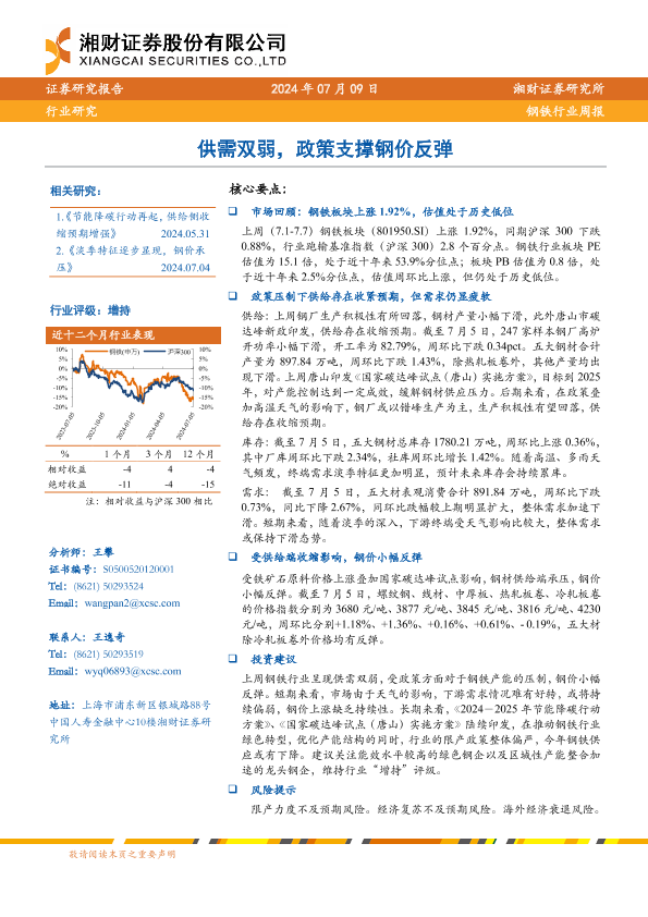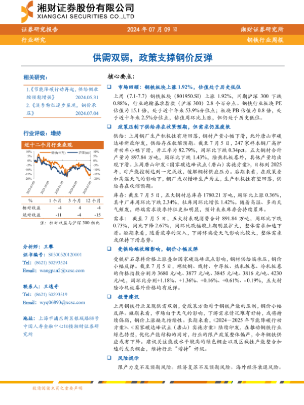 【湘财证券】【20240709】20240709-湘财证券-钢铁行业周报:供需双弱,政策支撑钢价反弹-10页