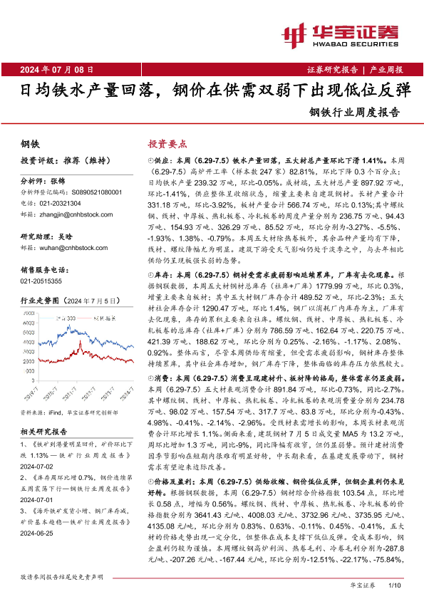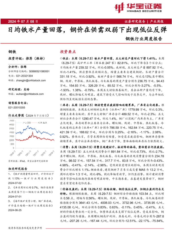 【华宝证券】【20240708】20240708-华宝证券-钢铁行业周度报告:日均铁水产量回落,钢价在供需双弱下出现低位反弹-10页