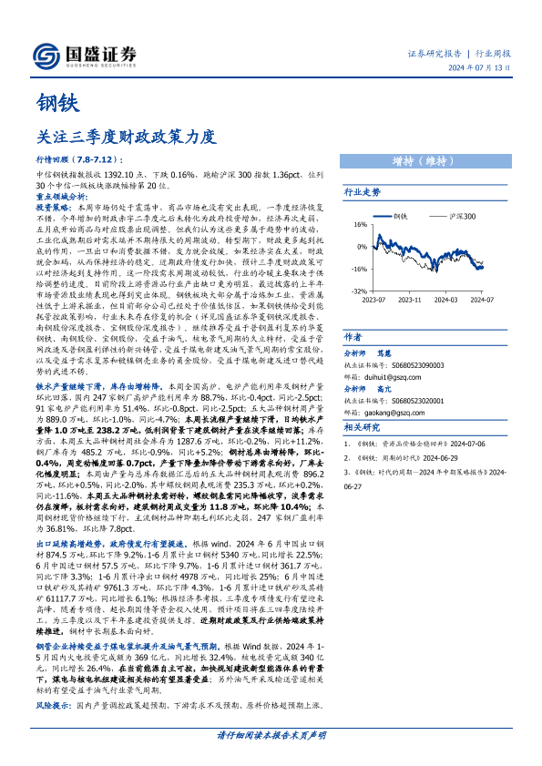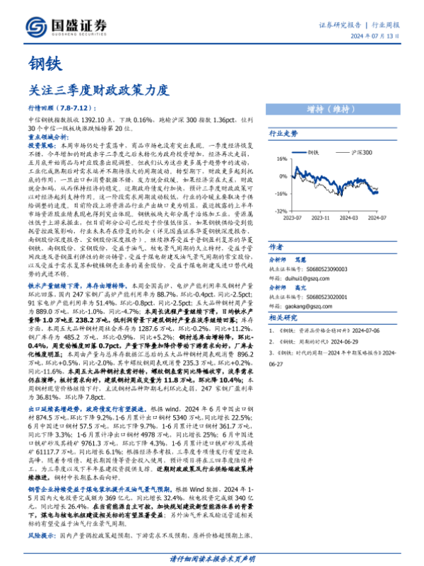【国盛证券】【20240713】20240713-国盛证券-钢铁行业周报:关注三季度财政政策力度-17页