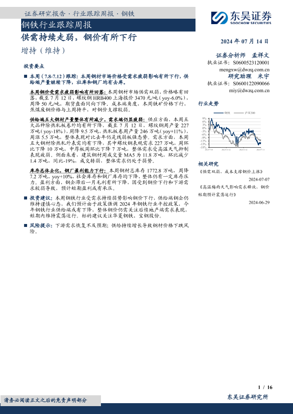 【东吴证券】【20240714】20240714-东吴证券-钢铁行业跟踪周报:供需持续走弱,钢价有所下行-16页