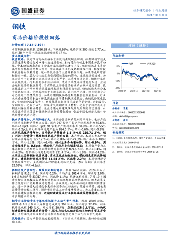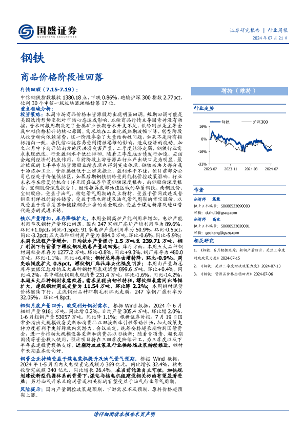【国盛证券】【20240721】20240721-国盛证券-钢铁行业周报:商品价格阶段性回落-16页