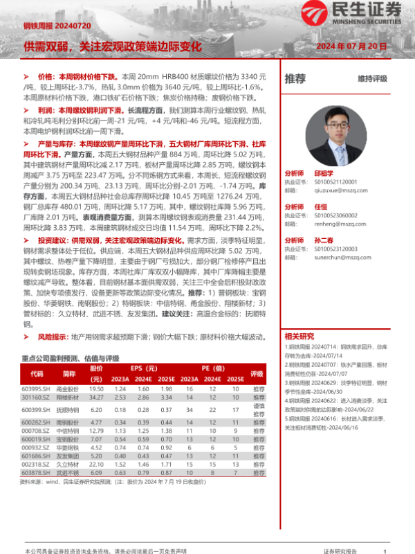 【民生证券】【20240720】20240720-民生证券-钢铁周报:供需双弱,关注宏观政策端边际变化-20页