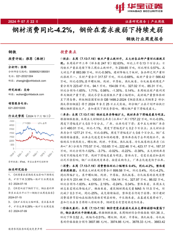 【华宝证券】【20240722】20240722-华宝证券-钢铁行业周度报告:钢材消费同比-4.2%,钢价在需求疲弱下持续走弱-10页