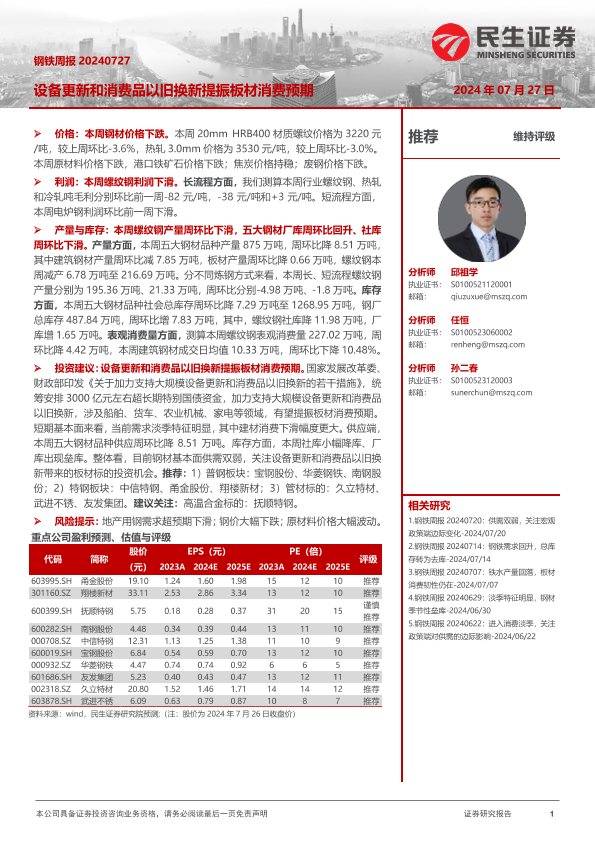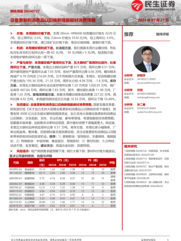 【民生证券】【20240727】20240727-民生证券-钢铁周报:设备更新和消费品以旧换新提振板材消费预期-20页