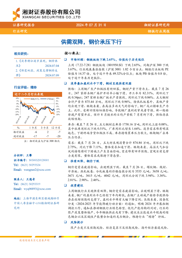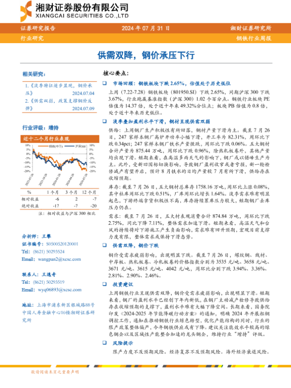 【湘财证券】【20240731】20240731-湘财证券-钢铁行业周报:供需双降,钢价承压下行-10页