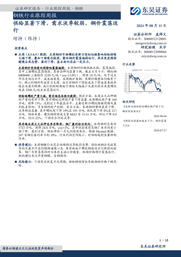 【东吴证券】【20240811】20240811-东吴证券-钢铁行业跟踪周报:供给显著下滑,需求淡季较弱,钢价震荡运行-15页