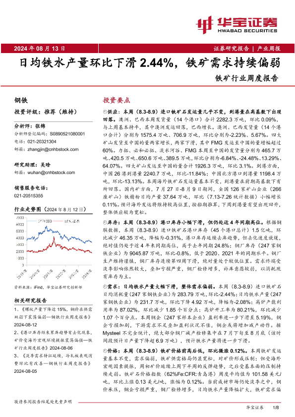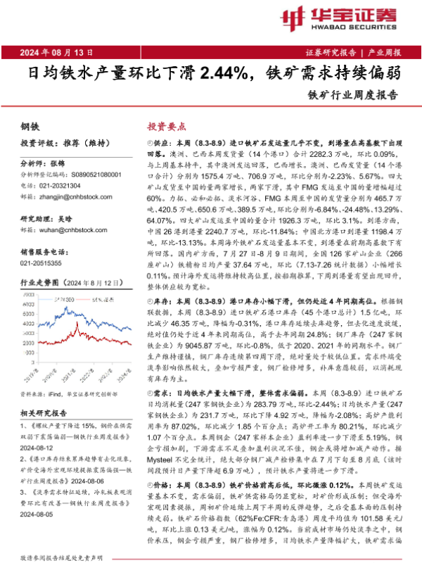 【华宝证券】【20240813】20240813-华宝证券-铁矿行业周度报告:日均铁水产量环比下滑2.44%,铁矿需求持续偏弱-8页