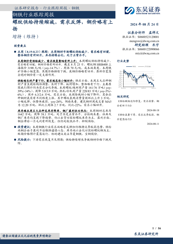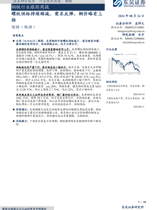 【东吴证券】【20240824】20240824-东吴证券-钢铁行业跟踪周报:螺纹供给持续缩减,需求反弹,钢价略有上扬-16页