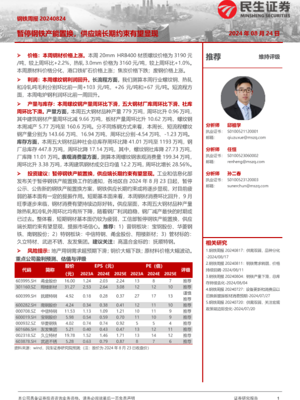 【民生证券】【20240824】20240824-民生证券-钢铁周报:暂停钢铁产能置换,供应端长期约束有望显现-20页