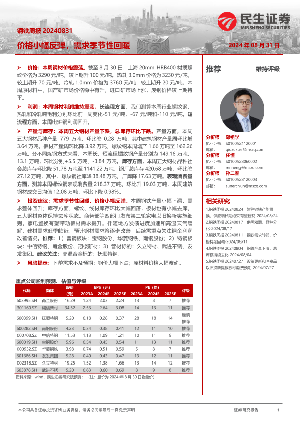 【民生证券】【20240831】20240831-民生证券-钢铁周报:价格小幅反弹,需求季节性回暖-20页