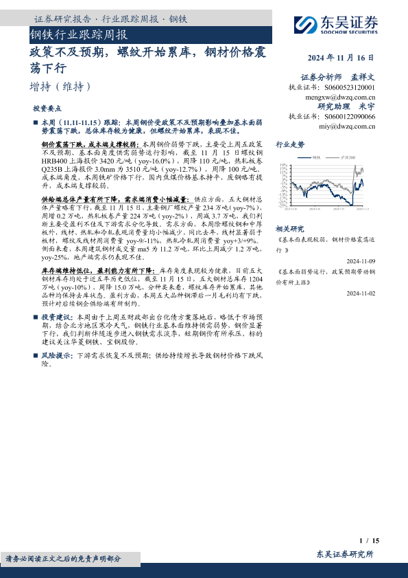 【东吴证券】【20241116】20241116-东吴证券-钢铁行业跟踪周报:政策不及预期,螺纹开始累库,钢材价格震荡下行-15页