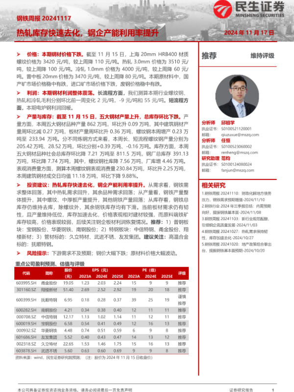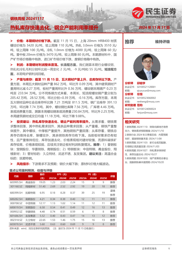 【民生证券】【20241117】20241117-民生证券-钢铁周报:热轧库存快速去化,钢企产能利用率提升-20页