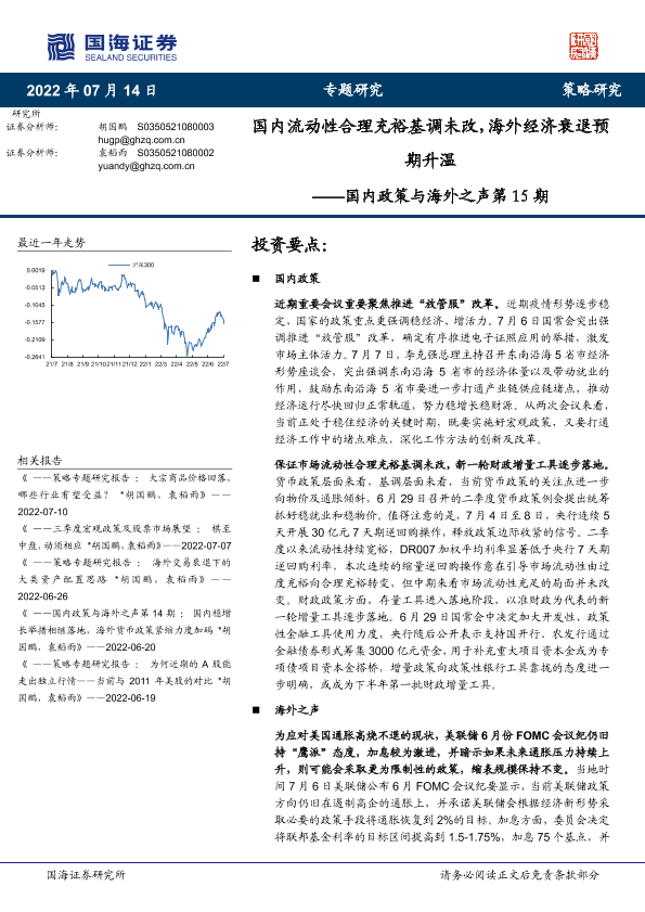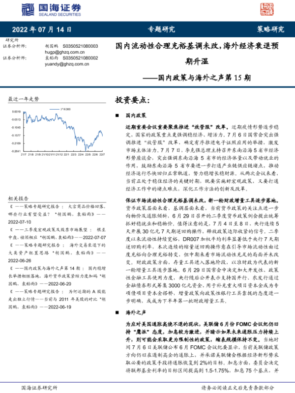 【国海证券】【20220714】国内政策与海外之声第15期:国内流动性合理充裕基调未改,海外经济衰退预期升温-20页