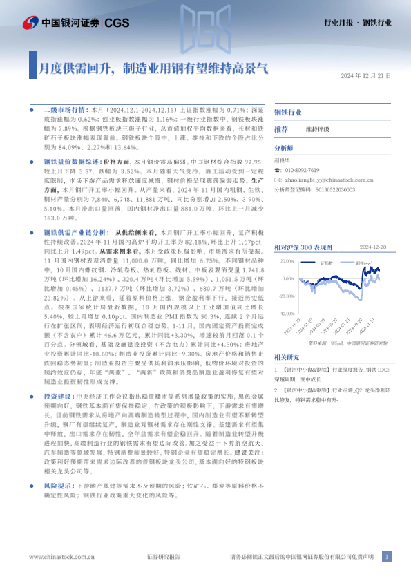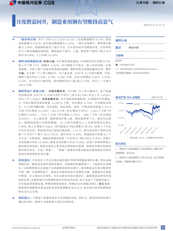 【银河证券】【20241221】20241221-中国银河-钢铁行业行业月报:月度供需回升,制造业用钢有望维持高景气-22页