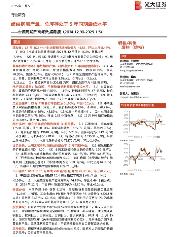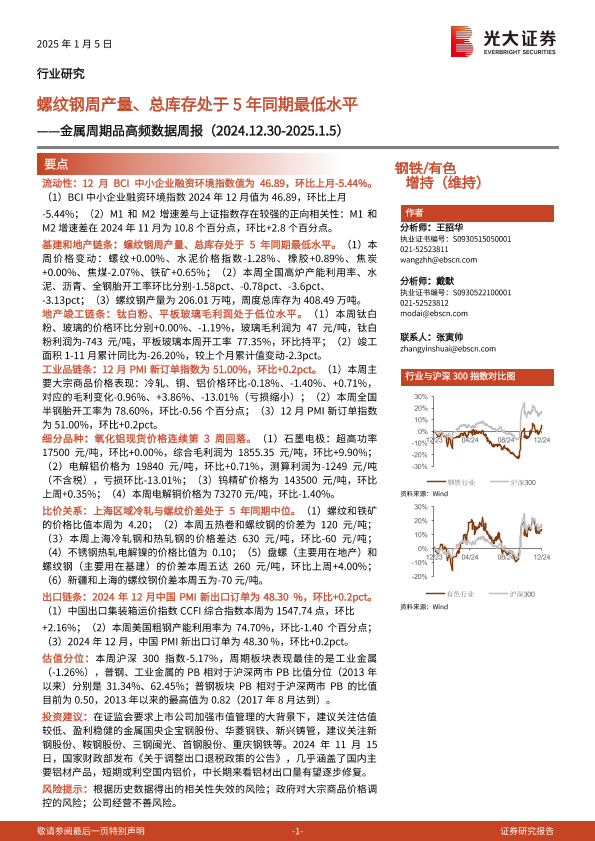 【光大证券】【20250105】20250105-光大证券-钢铁 有色行业金属周期品高频数据周报:螺纹钢周产量、总库存处于5年同期最低水平-27页