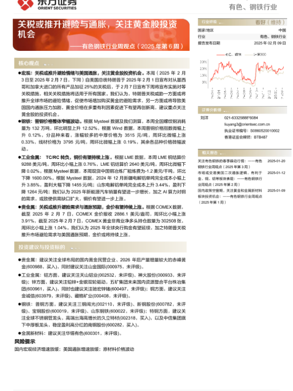 【东方证券】【20250209】2025年第6周有色钢铁行业周观点:关税或推升避险与通胀,关注黄金股投资机会-26页