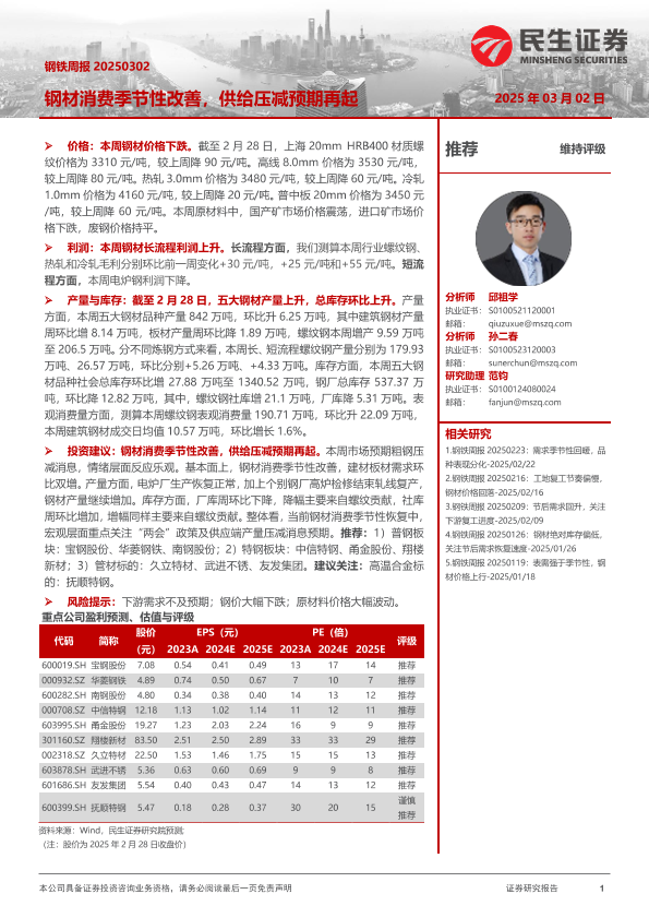【民生证券】【20250302】20250302-民生证券-钢材消费季节性改善,供给压减预期再起-20页