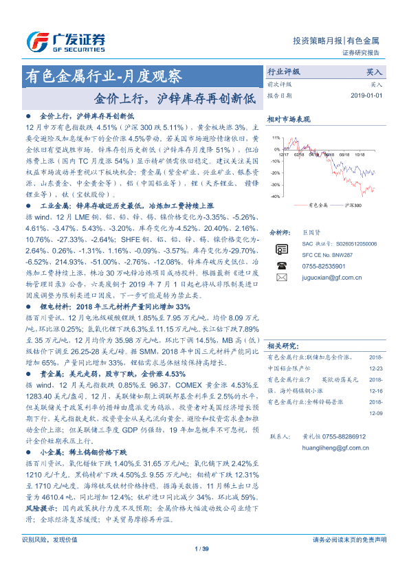 【广发证券】【20190101】20190101-广发证券-有色金属行业-月度观察:金价上行,沪锌库存再创新低-39页