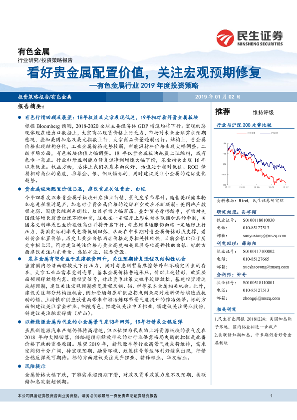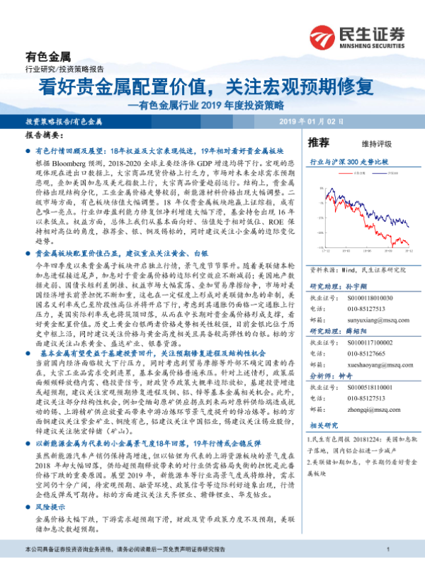 【民生证券】【20190102】有色金属行业2019年度投资策略:看好贵金属配置价值,关注宏观预期修复-63页