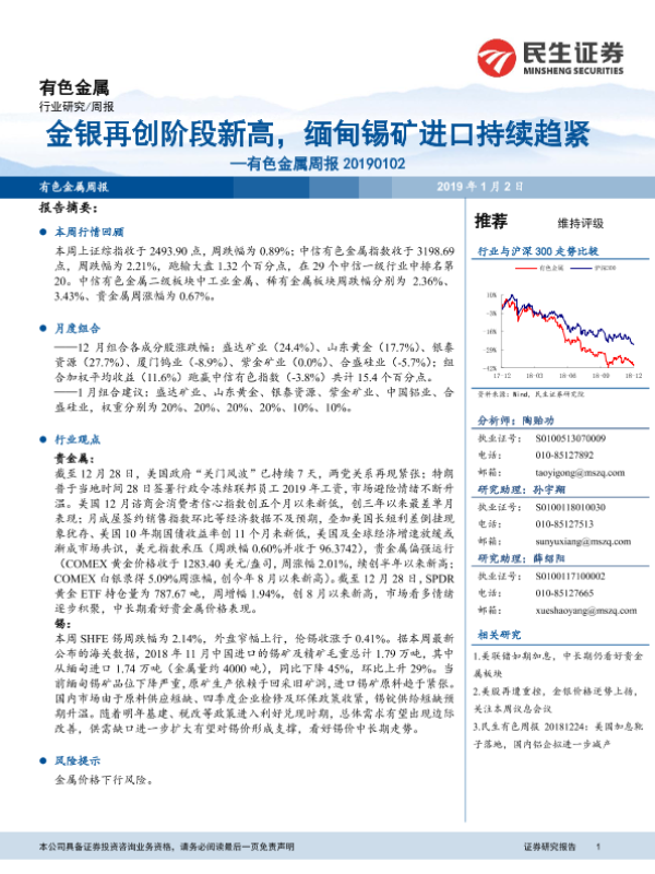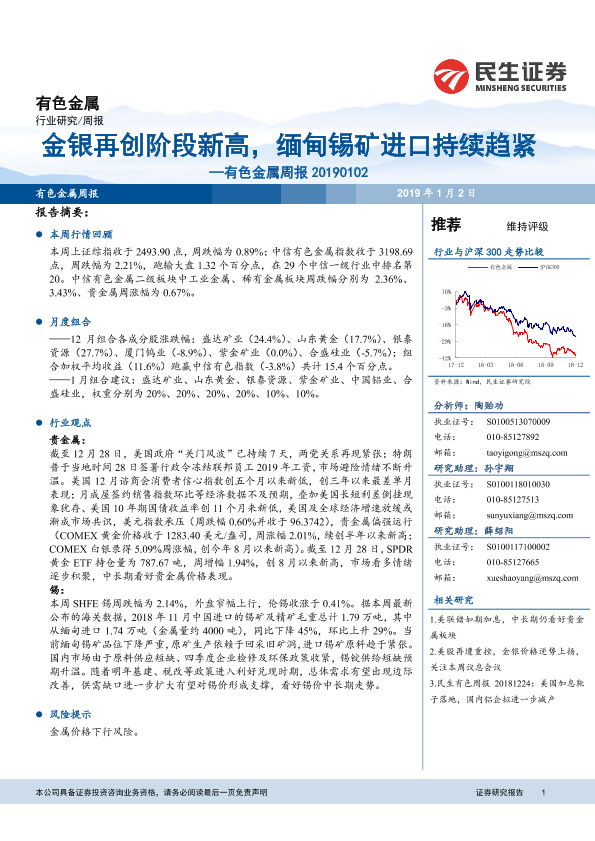 【民生证券】【20190102】20190102-民生证券-有色金属周报:铂钯金银再创阶段新高,缅甸锡矿进口持续趋紧-42页