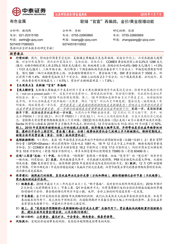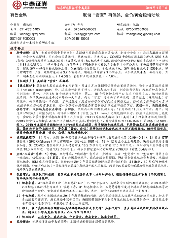 【中泰证券】【20190107】中泰证券-贵金属周报:联储“官宣”再偏鸽,金价/黄金股增动能-13页