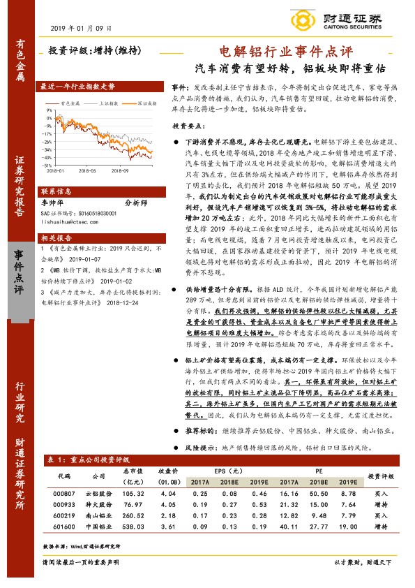 【财通证券】【20190109】电解铝行业事件点评:汽车消费有望好转,铝板块即将重估-2页