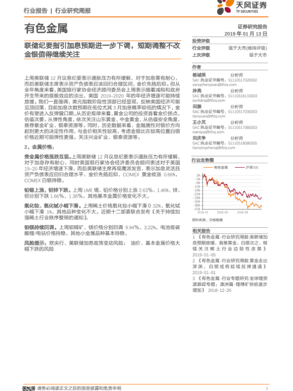 【天风证券】【20190113】有色金属行业研究周报:联储纪要指引加息预期进一步下调,短期调整不改金银值得继续关注-17页
