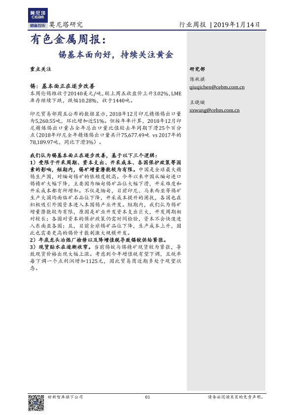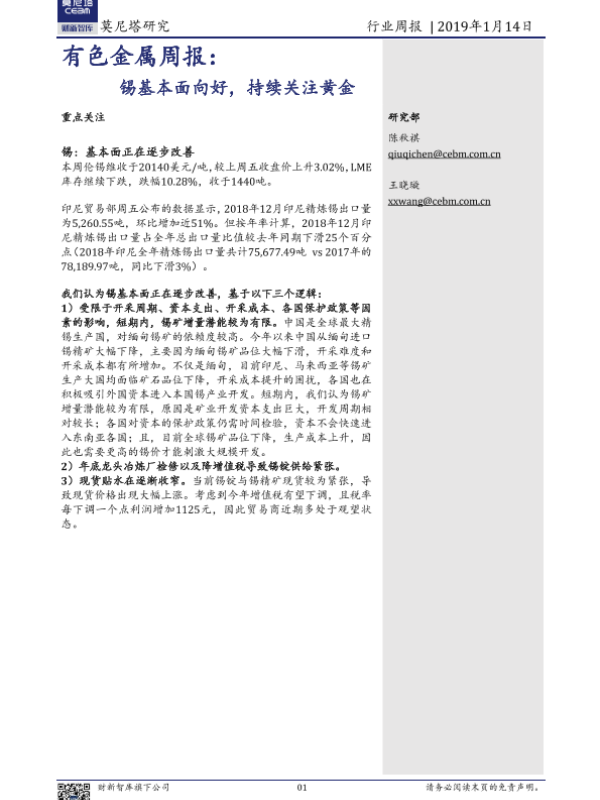 【莫尼塔研究】【20190114】20190114-莫尼塔投资-有色金属行业周报:锡基本面向好,持续关注黄金-11页