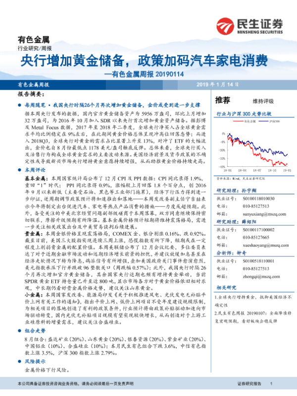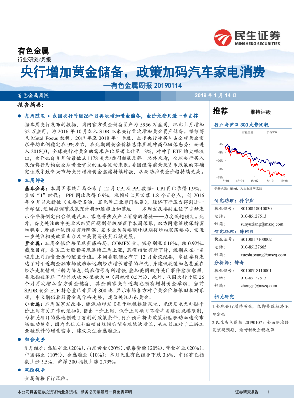【民生证券】【20190114】有色金属周报:铂钯央行增加黄金储备,政策加码汽车家电消费-39页