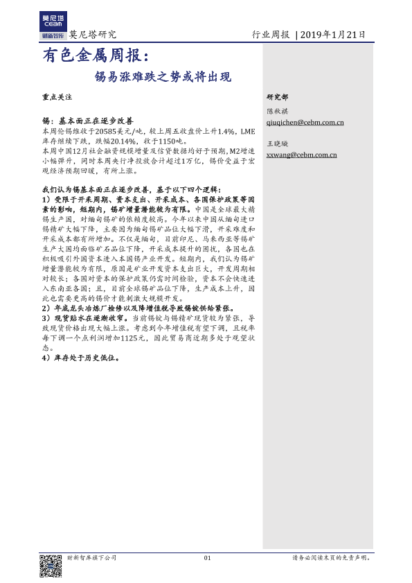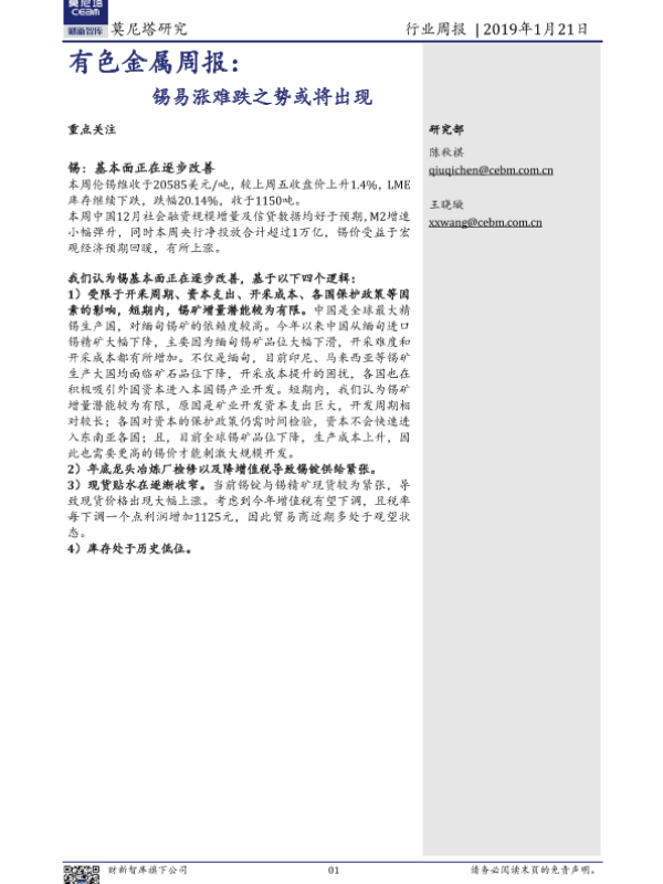 【莫尼塔研究】【20190121】20190121-莫尼塔投资-有色金属周报:锡易涨难跌之势或将出现-11页