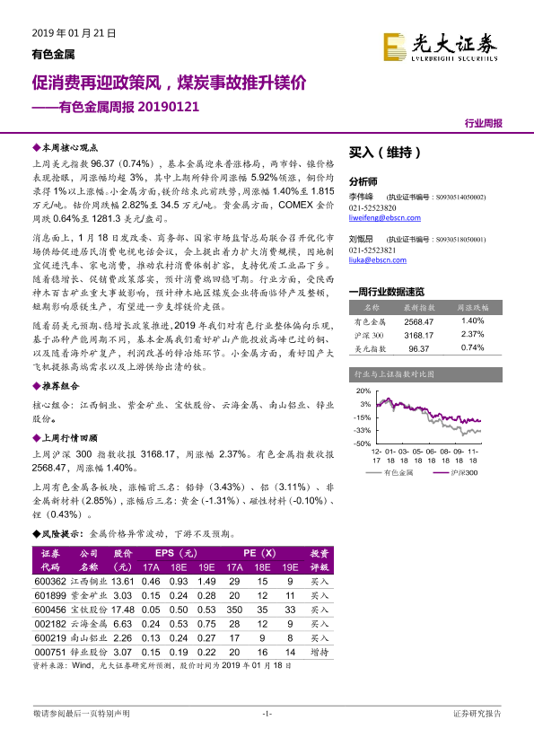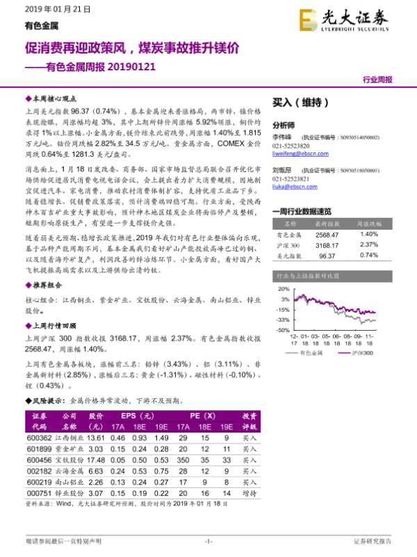 【光大证券】【20190121】20190121-光大证券-有色金属周报:促消费再迎政策风,煤炭事故推升镁价-17页