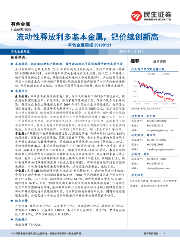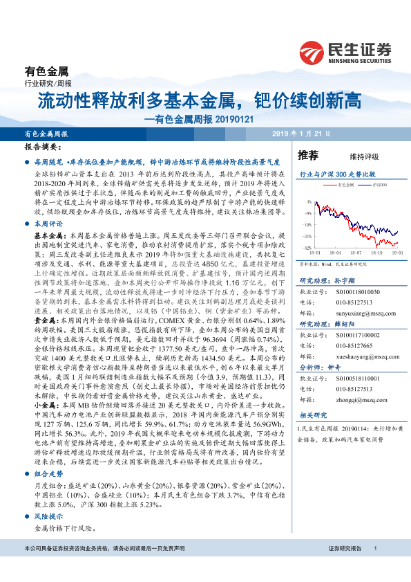 【民生证券】【20190121】20190121-民生证券-有色金属周报:流动性释放利多基本金属,钯价续创新高-39页
