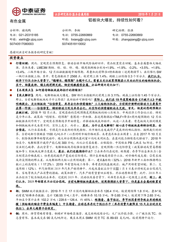 【中泰证券】【20190121】20190121-中泰证券-基本金属周报:铝板块大爆发,持续性如何看?-13页