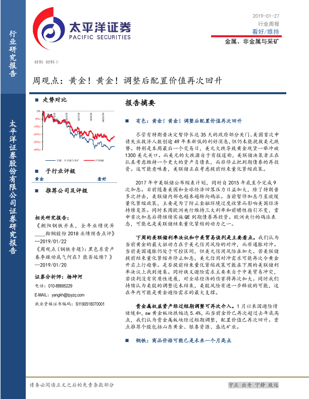 【太平洋证券】【20190127】20190127-太平洋-金属、非金属与采矿周观点:黄金!黄金!调整后配置价值再次回升-4页