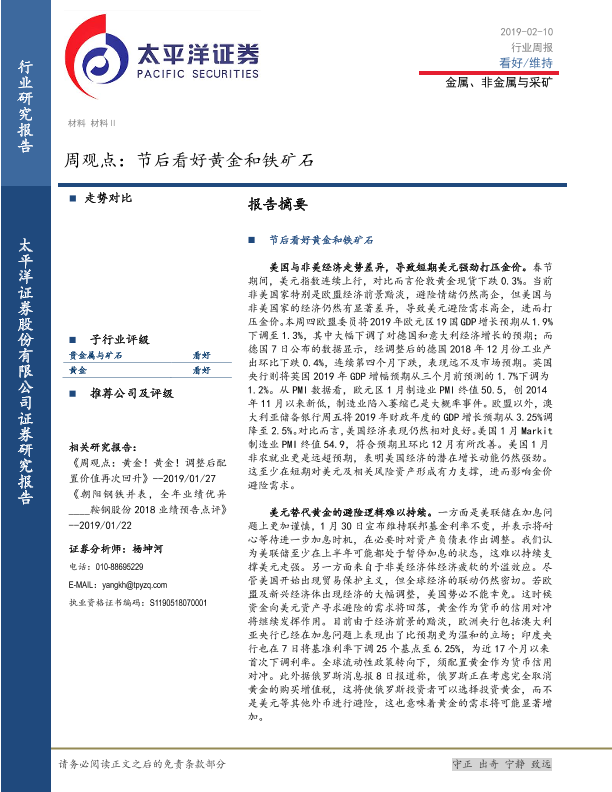 【太平洋证券】【20190210】20190210-太平洋-金属、非金属与采矿周观点:节后看好黄金和铁矿石-4页