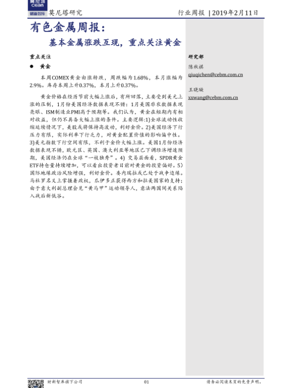 【莫尼塔研究】【20190211】20190211-莫尼塔投资-有色金属周报:基本金属涨跌互现,重点关注黄金-11页