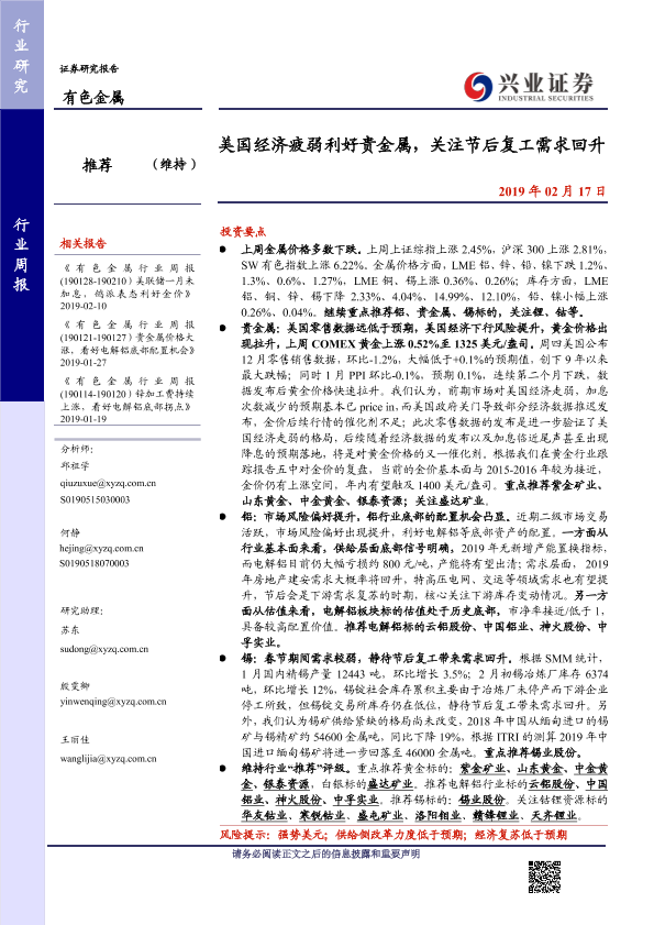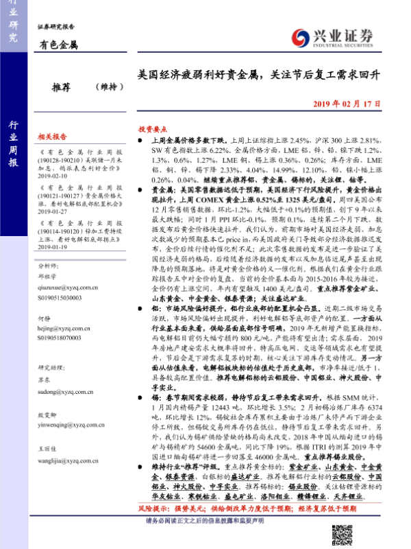 【兴业证券】【20190217】20190217-兴业证券-有色金属行业周报:美国经济疲弱利好贵金属,关注节后复工需求回升-14页