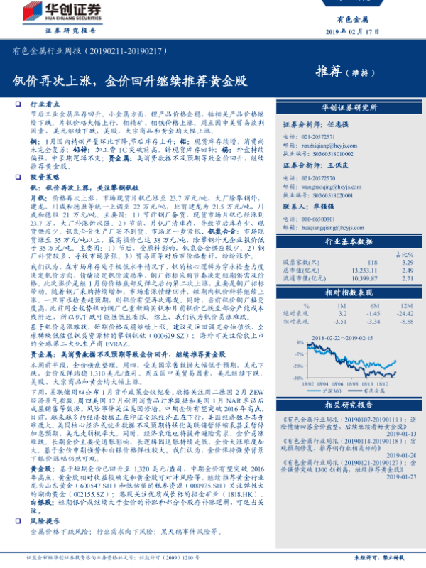 【华创证券】【20190217】20190217-华创证券-有色金属行业周报:钒价再次上涨,金价回升继续推荐黄金股-23页